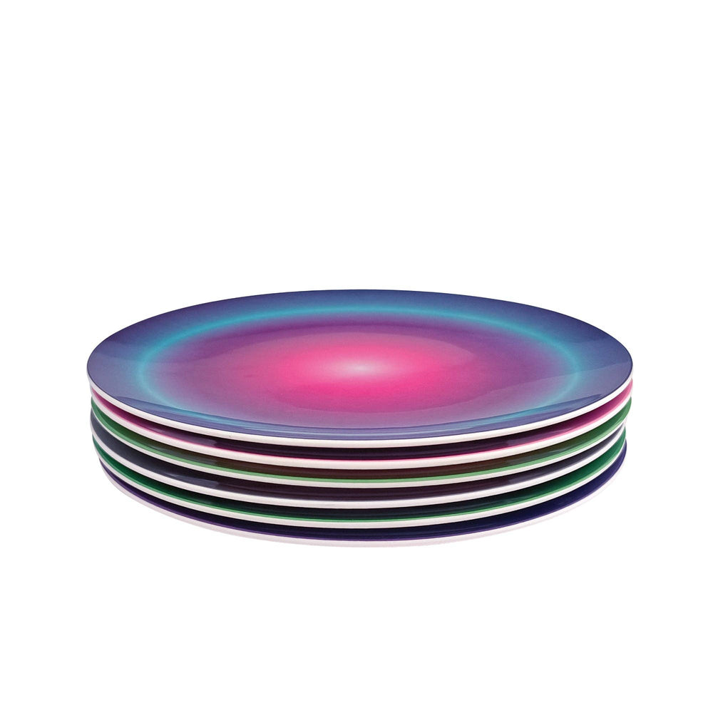 Generously sized sleek coupe-style lunch plate each with an iconic French Bull pattern. Good for everyday dining and indoor & outdoor entertaining. Pair with a salad bowl and servers, round and rectangular platters, stacked bowl sets, & ombre pasta bowls to fill out the look. LIVE VIVID!