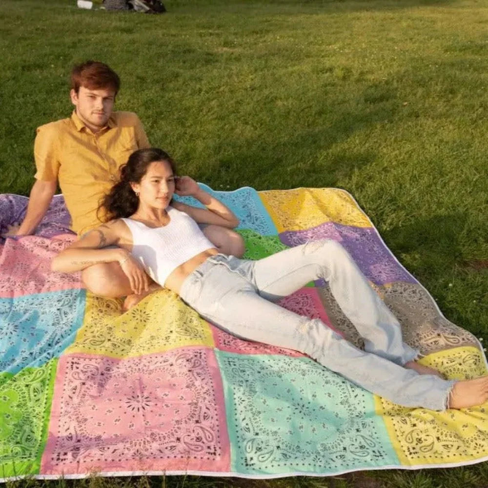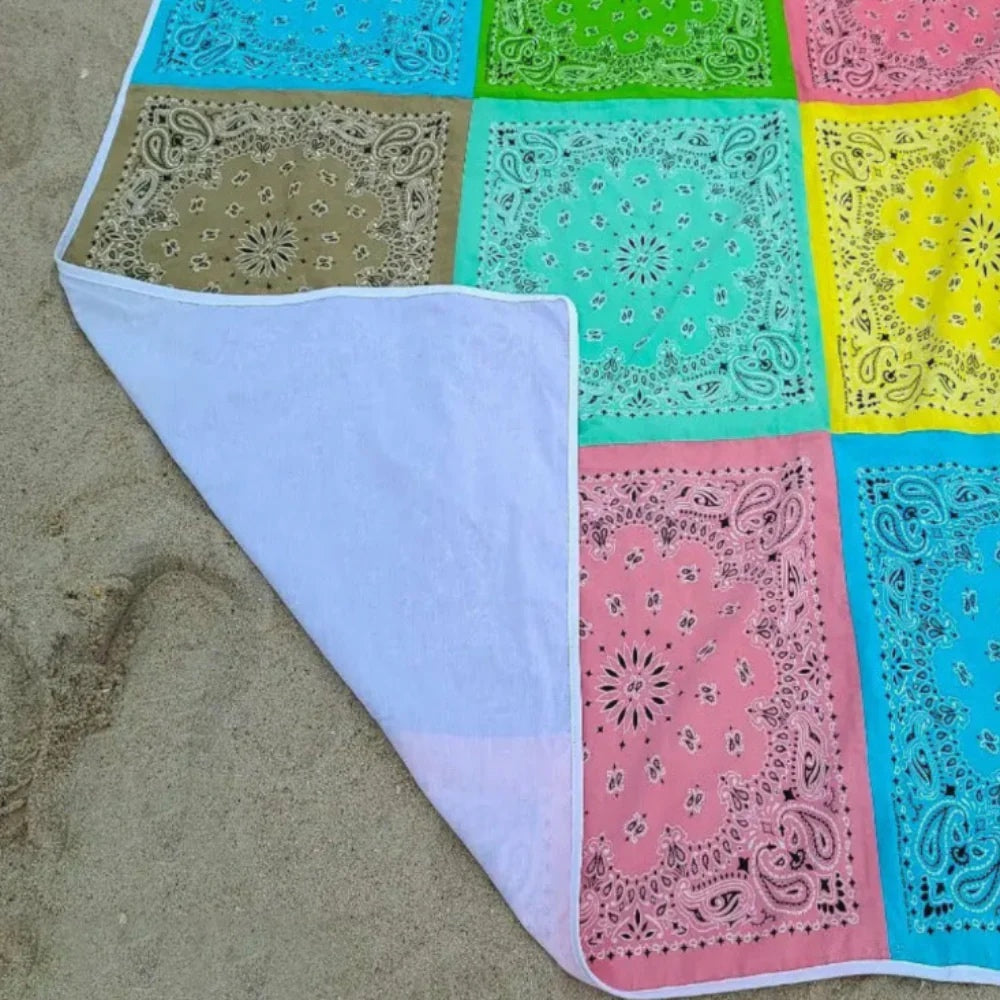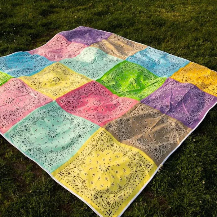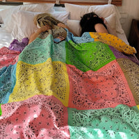 Embrace comfort and style with the Sweet Bandana Blanket, masterfully crafted from 16 cotton bandanas. This unique patchwork design pairs a fashionable bandana top with an ultra-soft, natural cotton sheet underside, offering both beauty and unparalleled comfort.