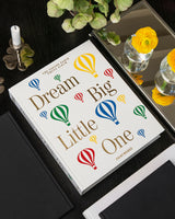 Capture and cherish your baby’s first years with our charming coffee table photo album Dream Big Little One, featuring a white cloth cover with gold foil text and silkscreen balloon prints in multiple colors.