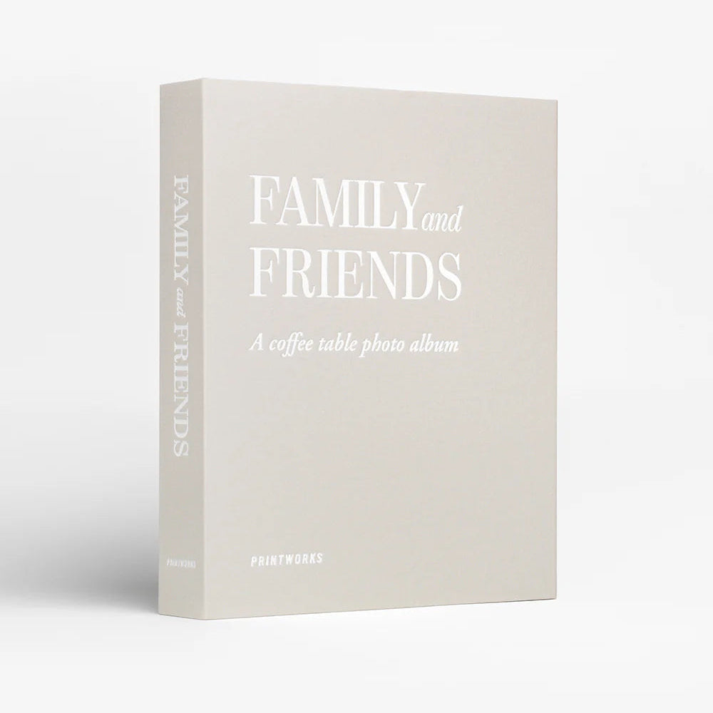 Discover our Family and Friends coffee table photo album, featuring an elegant light grey cloth cover with white text.