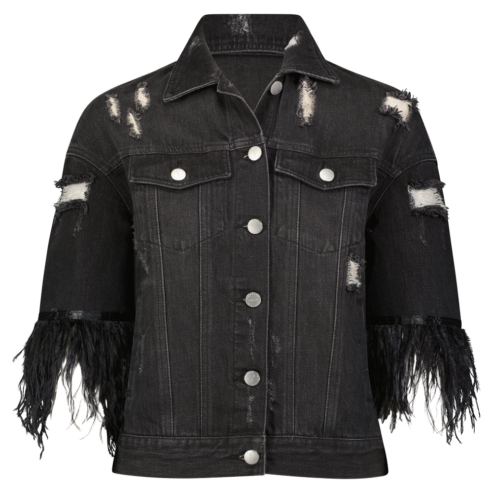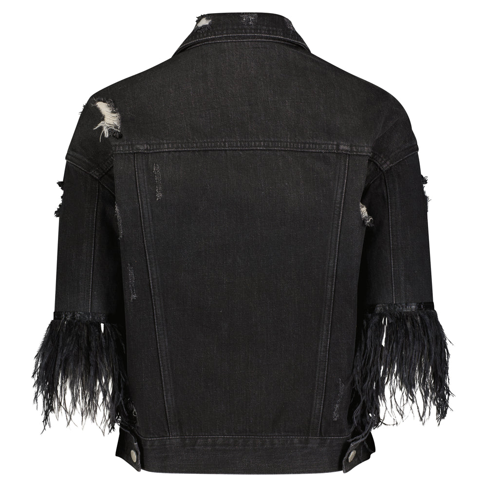 FeathersJean Denim Jacket perfect for any occasion. Crystal skull with white, silver and black stripes, down the middle of the back. In addition to the front flap pockets, there is single button fastening in the front and a back vent in the hem.