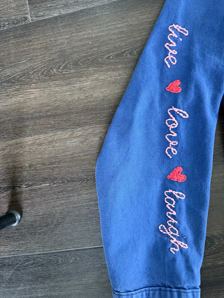 Covered in colorful messages like "be happy," "have fun," "love and love more," and "live life," plus peace signs, rainbows, hearts, and flowers—each detail is sewn by hand in Los Angeles with love. The front features the powerful phrase “LET THEM,” making this jacket not just a style statement, but a whole mood.