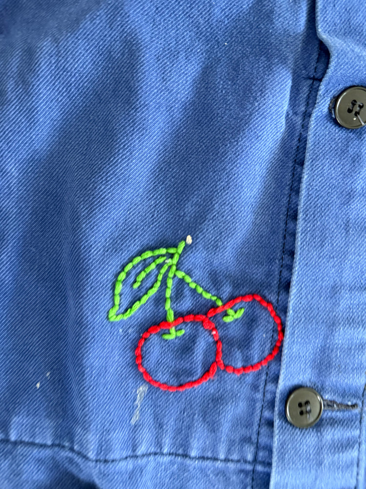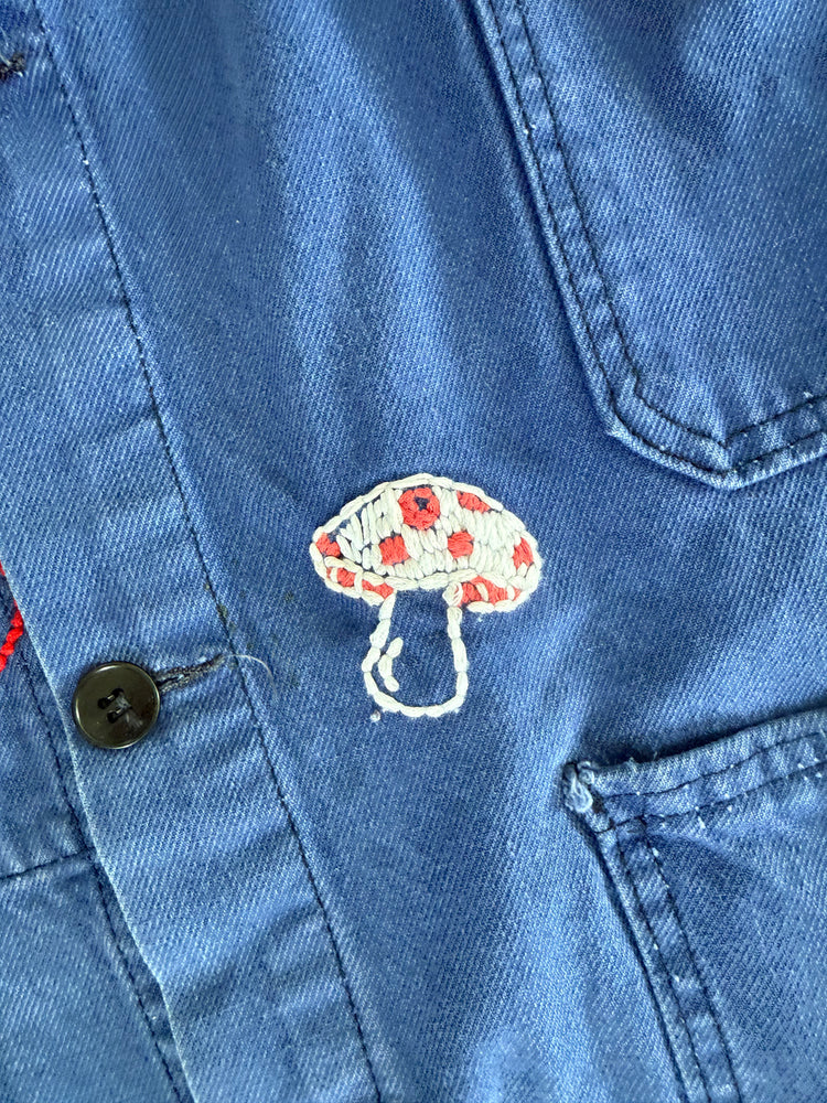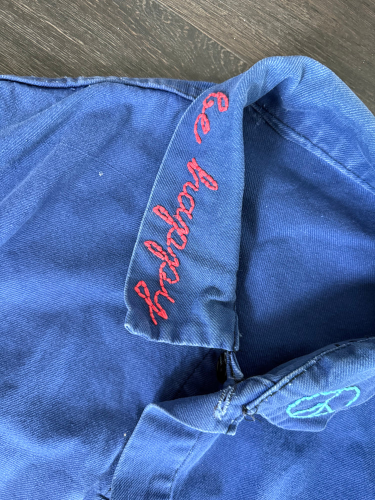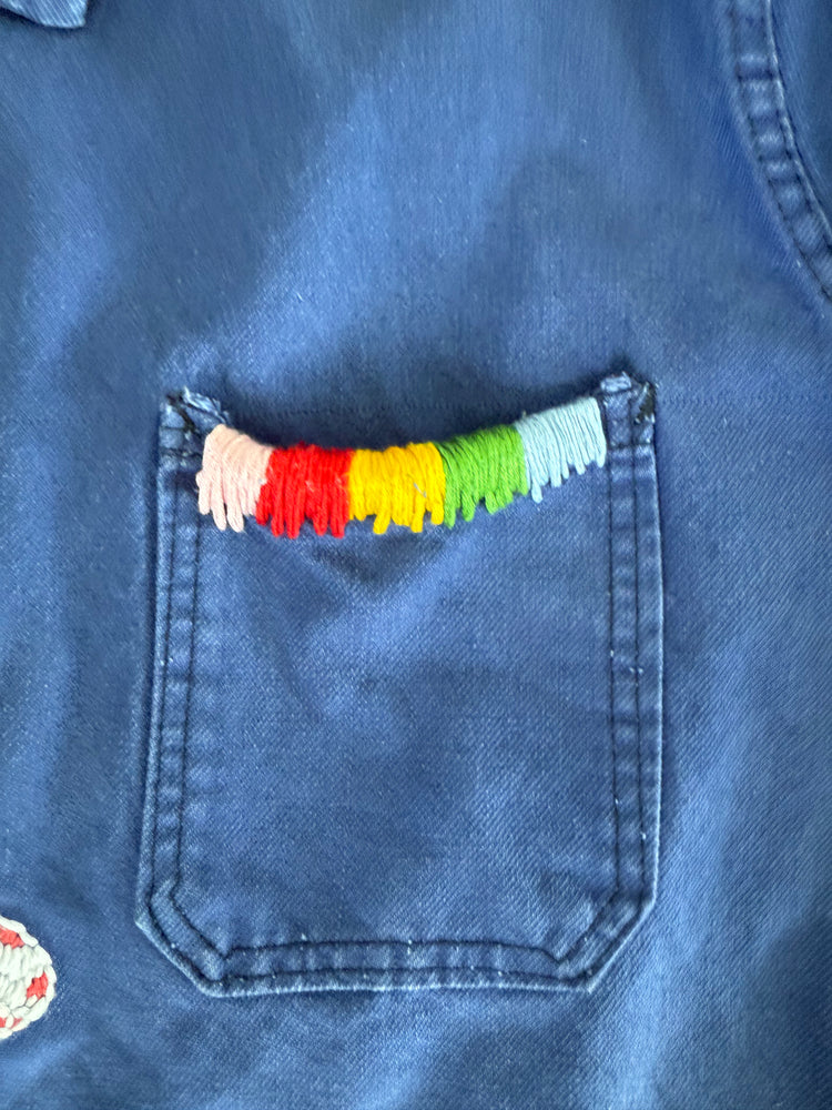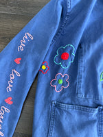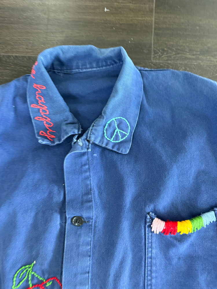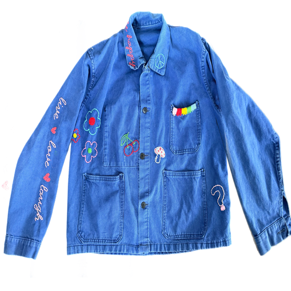 Say hello to your new happy place in jacket form. This one-of-a-kind piece started life as a vintage U.S. Army cotton sateen jacket and has been transformed into wearable joy with hand embroidery that radiates positivity.