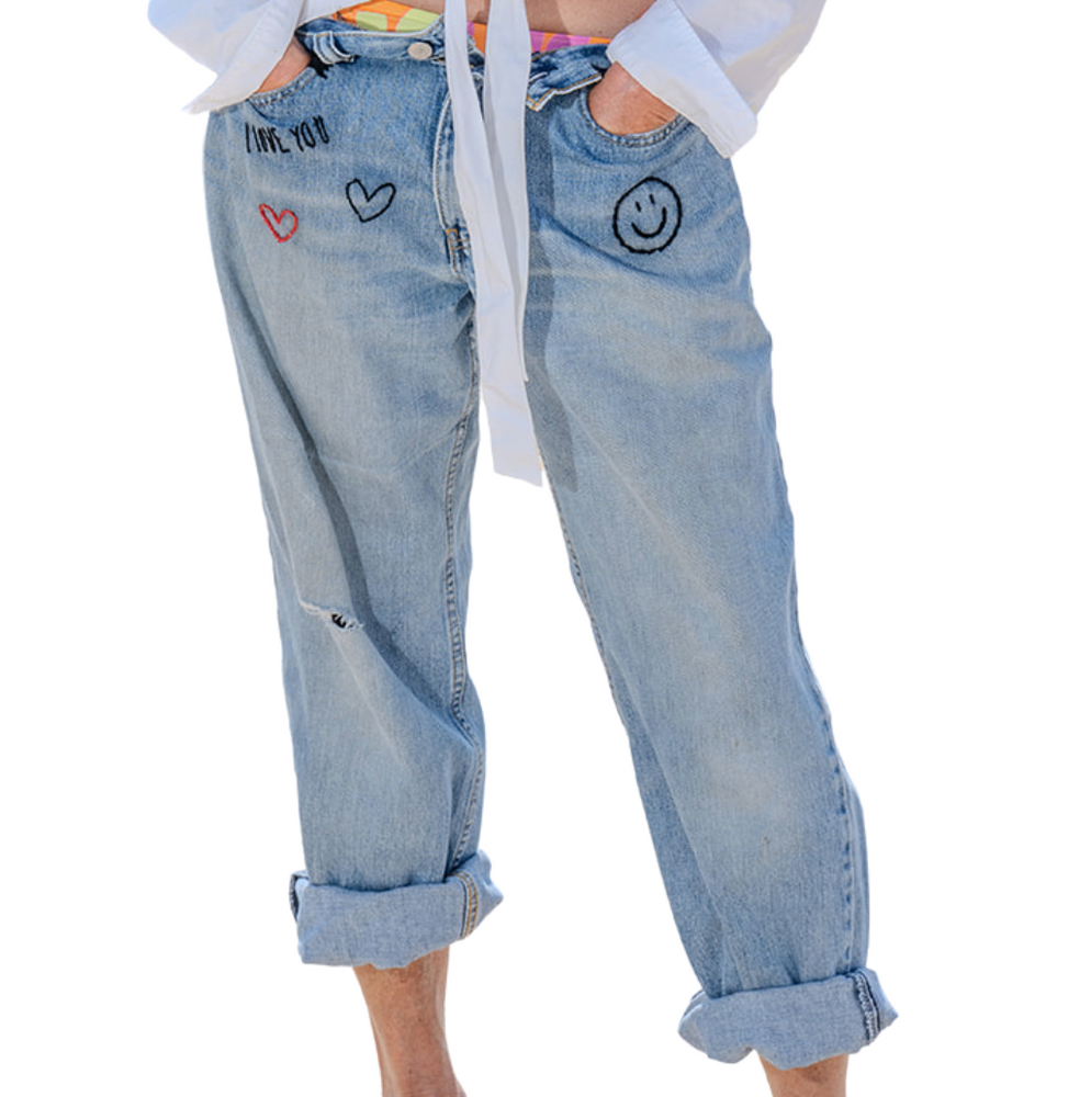 Discover our Denim Hand Embroidered Pants, perfect for adding a unique touch to your summer wardrobe.