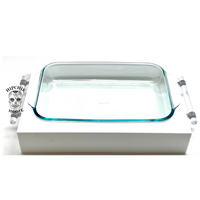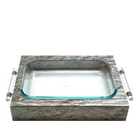 Acrylic Serving Tray with Pyrex Dish & lucite handles, perfect for entertaining.