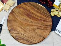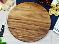 Our Large Round Charcuterie or Cutting boards are all made from one solid piece of wood. They measure 15 inches in diameter. Hand-crafted round board are perfect for serving charcuterie, appetizers, and highlighting entrees. Each board is unique, as we allow the organic nature of the tree's grain to craft each board. Made from East Indian Walnut, our boards are beautiful, durable, and coated with a food safe blend of organic beeswax and mineral oil. Boards can be customized with engraving of logos, names, or even hand written recipes.
