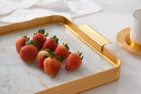 TAN8012WG The combination of striking aluminum with glass creates the Rectangular Tray from our Tango Collection. Suits all types of tables and is plenty chic for elegant occasions! Perfect for serving side dishes, appetizers, and desserts. Crafted with a stunning and elegant marble design. Hand-wash Only. Beautifully packed in a gift box.