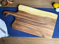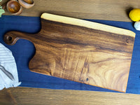 Our extra large handled boards are made from one piece of East Indian Walnut and measure 24" x 12" x 1". Hand-crafted live edge boards are perfect for serving charcuterie, appetizers, and highlighting entrees. Each board is unique, as we allow the organic nature of the tree to shape each board with a natural live edge. Our boards are beautiful, durable, and coated with a food safe blend of organic beeswax and mineral oil. Boards can be customized with engraving of logos and names.