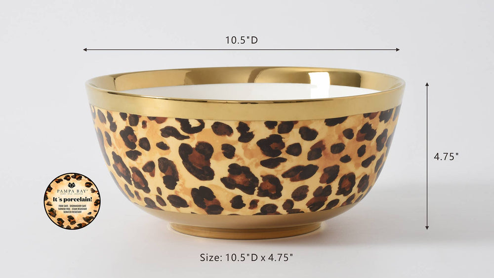 Add a touch of wild elegance to your home with this bold and exotic Large Bowl from our Animal Print Collection. Generously sized bowl for serving salads or side dishes like mashed potatoes, roasted vegetables, or rice! Stunning high-fired porcelain with an eye-catching animal print design and gold-toned rim.