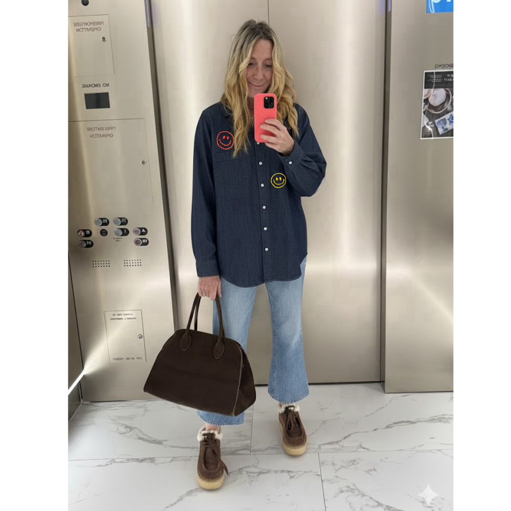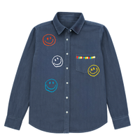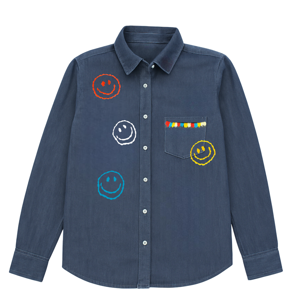 Embrace the joy of slow fashion with the HipChik Happy Face Button-Down. Each perfectly placed smiley is meticulously hand-embroidered, giving this classic shirt a distinct, one-of-a-kind character that machine stitching can't match.