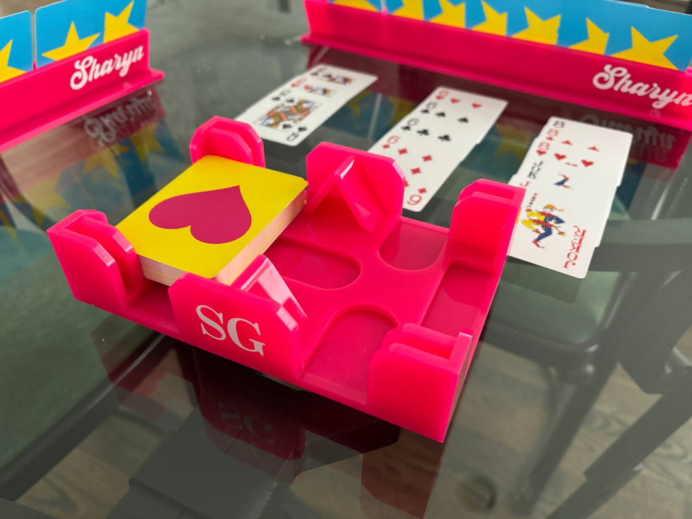 Canasta Spinner Tray made of acrylic and very pretty to look at while on your coffee table.Canasta Spinning card tray. Made from acrylic material in fun bright colors that is sturdy and hard to break. The spinner on the bottom makes playing the game fun and easy. Bright fun colors to choose from.