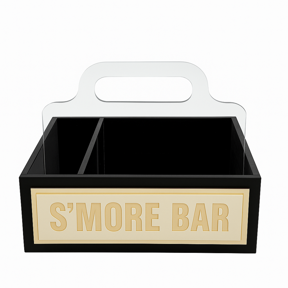 Make your next gathering extra sweet! This black acrylic caddy features compartments for all your s’mores-making essentials—graham crackers, chocolate, marshmallows, and sticks. Labeled “S’MORE BAR” and ready to wow at your next fire pit party.
